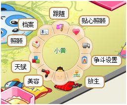 点击在“宠物屋”内点击自己的宠物,或者点击“我的宠物”面板中的宠物图片,会出现“宠物环形菜单”。