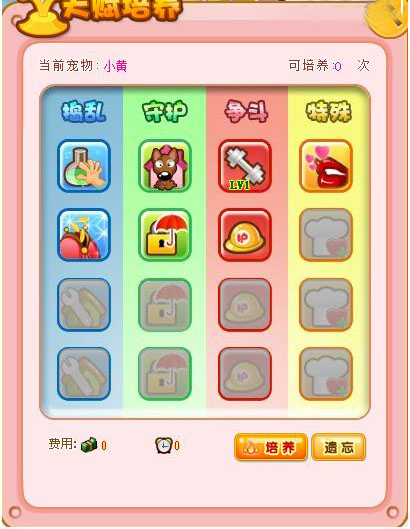 ——天赋培养分为:捣乱、守护、争斗、特殊四大类。其中前三项培养需要花费游戏币和时间,“特殊项”(即魅惑)的培养,需要花费贝贝币和时间;