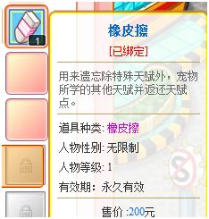 “橡皮擦”道具介绍:用来遗忘除“特殊”天赋外,宠物所学的其他天赋并返还天赋点。