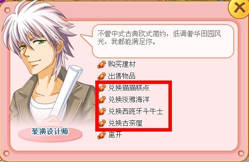 9月21日维护后,世博园区NPC“装潢设计师”处将停止兑换“猫猫糕点”、“淡雅海洋”、“西班牙斗牛士”、“古奈屋”四项外观装潢,请还未兑换的玩家在21日维护前及时兑换。