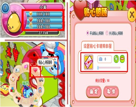 * 每张贴心照顾卡总容量为100,即可自动累积回复100的宠物所损耗数值,可一次设置“贴心照顾卡”使用数量。