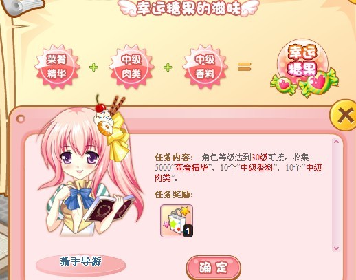 美丽的新手导师正在研制一种名为“幸运糖果”特殊食品,听说吃了它可以获得幸运奖励!快来帮助新手导师收集研究材料,就能品尝她新手制作的“幸运糖果”了!