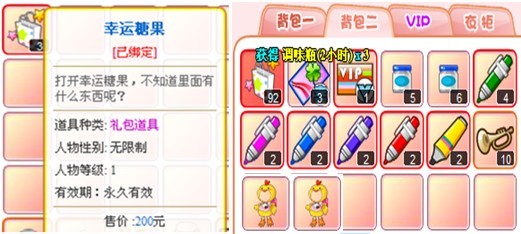 7天VIP卡、幸运卡*3张、可爱小鸡套装(7天)、可爱小鸡套装(永久)、1小时调味瓶*5、2小时调味品*3、紫色签名笔*2、红色签名笔*2、蓝色签名笔*2、粉色签名笔*2、绿色签名笔*2、加粗签名笔*2、小喇叭*10!
