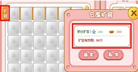3. 确认扩容后,仓库首行6格被成功激活,可使用,并同时会在画面显示“仓库扩容成功”的提示。