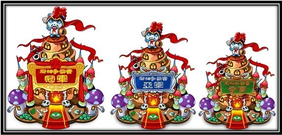 以上最终胜出者,将获得官方限量赠送的,代表全服极致荣誉与属性的厨神争霸赛冠军、亚军、季军外观装潢道具1件!