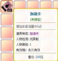 第三步:打开背包,选中“加油卡”双击使用,车库中“油量”会对应显示油量数额。