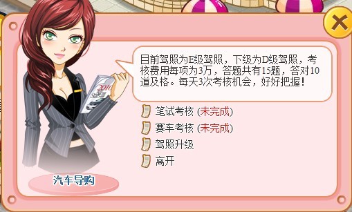 √“驾照考核”的需要:花费游戏币。按驾照级别,逐级增加所需费用。