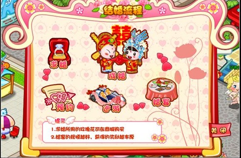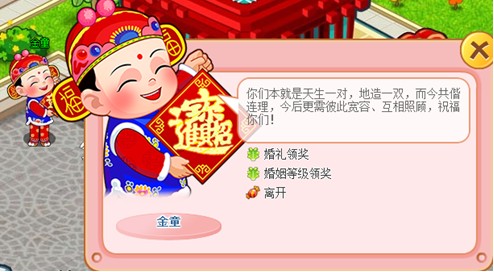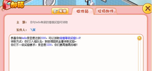 2.当满足结婚等级提升条件,系统邮件会及时给予通知;要求“新人”双方组队前往“世博园”NPC“金童”处领取奖励。