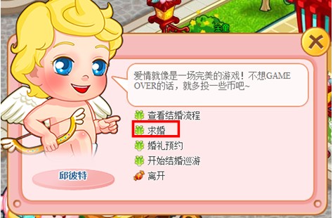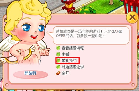 第一步:与NPC“丘比特”对话,选择“婚礼预约”。