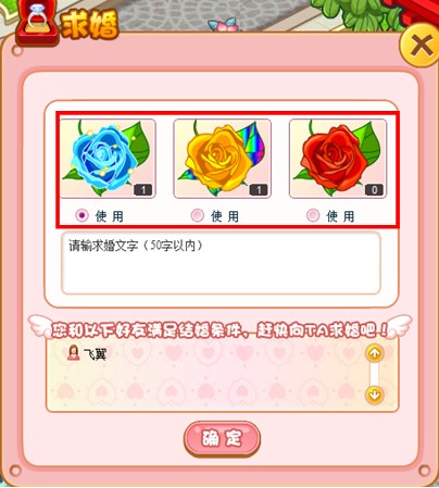 第三步:在“求婚”对话框中,选择求婚道具,输入求婚文字,选定求婚对象(好友名字)后,点击确定。