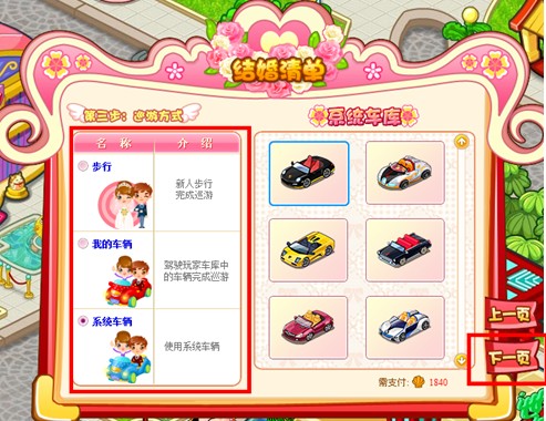 第四步:点击选择“巡游方式”(选择系统车辆巡游方式,是需要花费一定贝贝币的),再点击“下一页”。