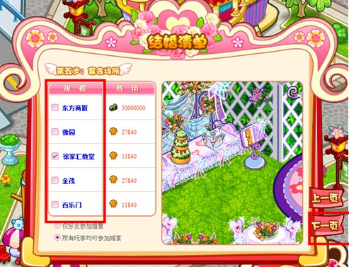 第六步:点击选择“宴会场所”(共有中、西两式的婚宴场所,对应各种著名地标建筑又分有各档次的婚宴场所),再点击“下一页”。