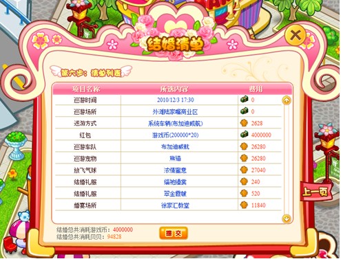 第七步:查看结婚“清单列表”,确认后点击提交,支付总费用后“预约”成功。(当“婚礼预约”时间到了,即可开始“婚礼巡游和婚宴”。