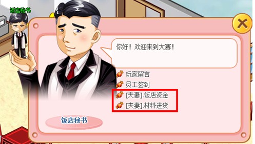 2.“新人”进入对方饭店,与NPC“饭店秘书”对话,可以选择“饭店资金”取出和“材料进货”的两项“夫妻之间”的独有功能。