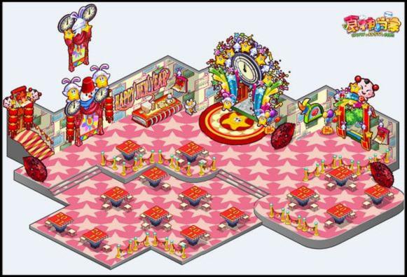 小兔儿多多与布满开心五角星的餐厅风格,十分达意的希望广大玩家们“2011兔年开心大快乐”。而运用多种活泼色彩设计的餐厅桌椅和地板,无法掩盖朝气蓬勃的红色主色调。