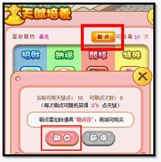 a、在宠物的“天赋培养面板”上方,点击“刷点”,打开刷点功能面板。(宠物每次升级均会累计一次“可刷点”机会。)