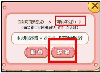 c、当刷出满意的点数后,点击“获得”,就可为宠物增加额外的可用天赋点。并减少一次“可刷点次数”!(获得0点时,不减少可刷点次数)