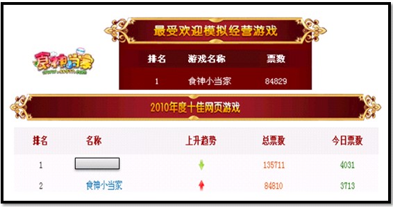 在广大玩家热情如火的支持,每日不懈的投票下,连连造就着3D开心餐厅《食神小当家》角逐“2010年中国网页游戏金页奖”的傲人成绩:截至昨日,《食神小当家》依然稳居“2010年度最受欢迎模拟经营游戏”排名第一位,同时位居“2010年度十佳网页游戏”第三位!