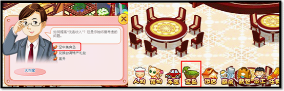 1、去游戏内世博园小当家饭店,和NPC“大当家”对话;( 也可点击游戏主界面下方快速功能栏中的“空岛”按钮,自动导航至“大当家”处。)