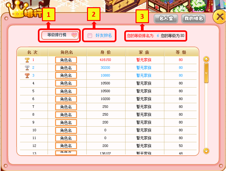 1、排行种类:等级排行、身价排行 2、选取后只显示好友排行3、玩家自身名次