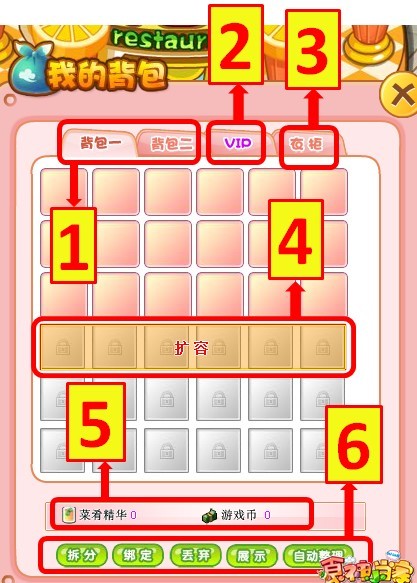 1 背包:角色游戏内道具、菜肴的存放处,共有2个背包