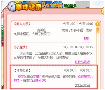 当有玩家发起投票,事件记录内将出现提示,玩家可通过事件记录直接到达该玩家饭店,随意选择一个选项投票后就可获得相应奖励。