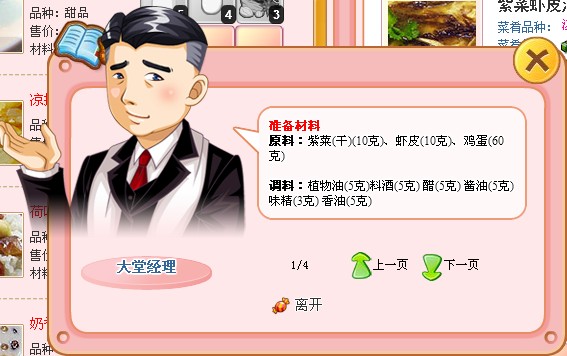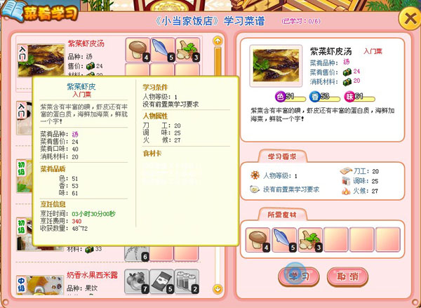 在《食神小当家》的菜谱中,对每道菜肴都有详细的描述,选择学习后,大堂经理将会详细的介绍该菜肴的全部烹饪方法,从原料、配料倒细致的烹饪步骤,尽在掌握。留心记忆这些菜谱,不仅可以在菜肴学习后回答相关问题,得到更丰厚奖励。下线之后,便可以现学现用,为自己的餐桌添加一点颜色。