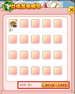 5, 点击“确定兑换”完成兑换,点击“全部取回”,将菜肴收回至背包,放弃兑换;
