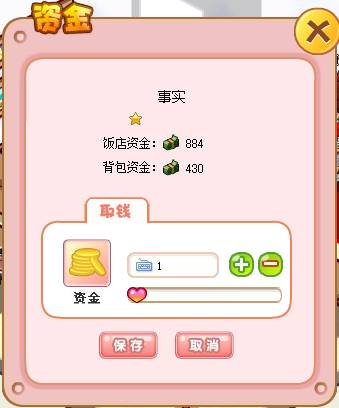 通过 “+、-”或拖动滑块的方式选择要从饭店中取出到背包的资金数额。