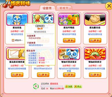 “饭店科技”是饭店中的重要功能之一,花费游戏币对饭店各项科技进行研发,可以直接影响饭店的各项属性数值,提高饭店效率。