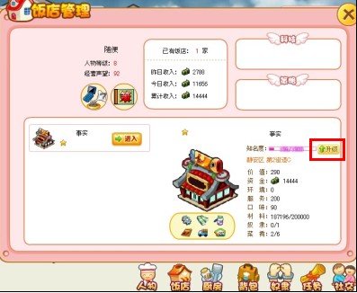 点击界面右下方的“饭店”按钮,开启饭店界面,在左侧选择要升级的饭店后,在饭店形象右侧点击“升级”按钮,开启“升级饭店”窗口