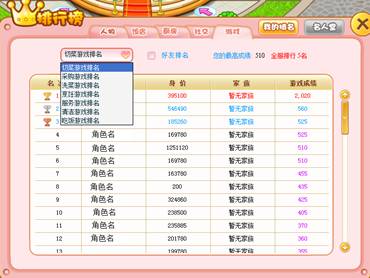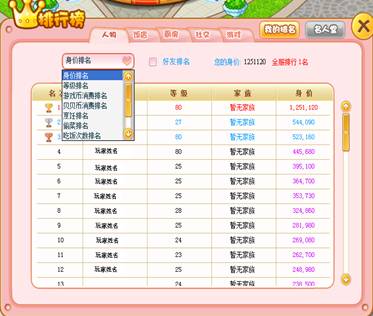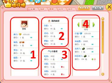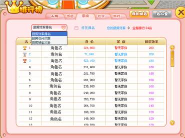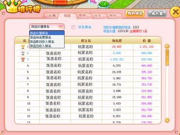 小当家内拥有全方位的排行系统,玩家可以迅速清晰的了解到自己的各方面属性在游戏中的排名。排行包括身价、厨房效率、厨房被访问次数、饭店价值、饭店收入、购物消费、摘菜菜次数、吃饭次数、地区人数、个人喜好、小游戏分数等超多排行