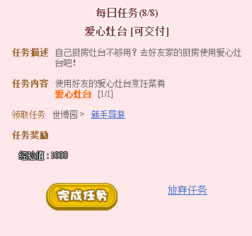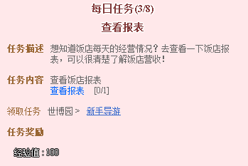 游戏内玩家可在世博园区NPC“新手导游”处接取每日任务,每位玩家一天可领取一次,每次任务分为8个子任务,前7个子任务完成后可获得游戏币奖励,最后一个子任务完成后玩家可获得高额经验、喇叭、各类签名笔1天,调味瓶、冷却剂等随机道具。